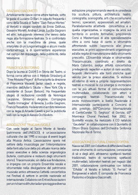 Con sede legale al Sacro Monte di Varallo (patrimonio dell’UNESCO), è un’associazione culturale che dal 1995 si occupa di eventi legati alla Musica Antica. L’associazione opera nel settore della musicologia per l’interpretazione delle fonti alla luce della più attuale ricerca delle prassi esecutive e della scienza organologica (liuteria, costruzione e restauro degli strumenti storici). Triacamusicale, sin dalla sua fondazione, si impegna con un proprio Ensemble vocale e strumentale nella divulgazione del patrimonio musicale antico attraverso l’attività concertistica nei Festival di settore in ambito nazionale ed internazionale. Collabora con Enti ed Associazioni per un richiamo di fruitori ad ampio raggio e diversa estrazione programmando eventi in sinestesia tra scultura, pittura, architettura, teatro, coreografia, scenografia, arti che accomunano tecnici, specialisti, appassionati ed amatori. Parallelamente all’attività concertistica e a quella organizzativa, si impegna da anni sul territorio in ambito formativo, proponendo Corsi e Masterclass di alta specializzazione oltre a corsi base di canto e strumento affrontando subito l’approccio alle prassi esecutive, ai primi apprendimenti organologici ed alle regole di manutenzione dello strumento prescelto. L’Ensemble vocale e strumentale Triacamusicale, coordinato e diretto da Mara Colombo, svolge attività concertistica privilegiando repertori e autori di raro ascolto, facendo riferimento alle fonti storiche quali veicolo per la prassi esecutiva. Si esibisce all’interno di vere e proprie rappresentazioni teatrali e musicali le cui sinergie si incrociano con le più attuali forme di comunicazione multimediale, collaborando con attori e compagnie teatrali. Triacamusicale ha avuto riconoscimenti a livello Nazionale e Internazionale partecipando a Concorsi di alto prestigio (40°Concorso Internazionale di CantoCorale “G. Seghizzi” di Gorizia, 40° Montreux Choral Festival). Nel 2002, in Quintetto vocale, ha realizzato il CD natalizio “Gaudete!” in collaborazione con il Quintetto di Ottoni Brass Express dell’Orchestra Sinfonica Nazionale Rai di Torino.