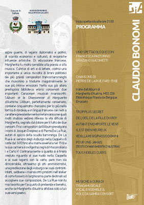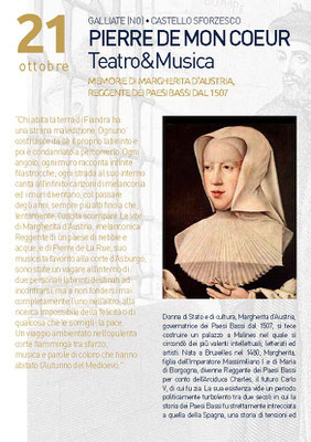 Donna di Stato e di cultura, Margherita d’Austria, governatrice dei Paesi Bassi dal 1507, si fece costruire un palazzo a Malines nel quale si circondò dei più valenti intellettuali, letterati ed artisti. Nata a Bruxelles nel 1480, Margherita, figlia dell’Imperatore Massimiliano I e di Maria di Borgogna, divenne Reggente dei Paesi Bassi per conto dell’Arciduca Charles, il futuro Carlo V, di cui fu zia. La sua esistenza vide un periodo politicamente turbolento tra due secoli in cui la storia dei Paesi Bassi fu strettamente intrecciata a quella della Spagna, una storia di tensioni ed aspre guerre, di legami diplomatici e politici, di scambi economici e culturali, di reciproche influenze artistiche. Di educazione francese, Margherita fu molto sensibile alla poesia e alla musica. Cultrice di arti e di lettere, costruì una importante e unica raccolta di brani polifonici dei più grandi compositori franco-fiamminghi che riuscirono a tradurre magistralmente le sue più intime emozioni. Nella sua già allora prestigiosa biblioteca erano conservati due importanti Canzonieri musicali manoscritti: l’Album et le Chansonnier di Marguerite d’Autriche. L’Album, perfettamente conservato, contiene cinquantotto chansons per lo più nella forma di rondeau e in lingua francese con testi a carattere prevalentemente melanconico nei quali molti studiosi vedono riflessa la vita difficile di Margherita, segnata dal dolore per il lutto dei due consorti. Fra i compositori dell’Album prevalgono i nomi di Josquin Desprez e di Pierre De La Rue, autori di spicco della scuola fiamminga. De La Rue è al servizio degli Asburgo nella Cappella di corte dal 1492 fino alla morte avvenuta nel 1518 e la sua carriera si svolge fra i regni di Massimiliano I e Carlo V. Contrariamente a quanto si è finora creduto riguardo al suo ruolo nella Cappella e ai suoi legami con la corte, pare non sia dimostrabile, attraverso gli atti amministrativi, una predilezione degli Asburgo nei suoi confronti. Infatti, sebbene i manoscritti prodotti nell’atelier di corte fossero in larghissima parte destinati ad accogliere sue composizioni, De La Rue non fu mai favorito per l’acquisto di prebende e benefici, anche se Margherita d’Austria affidava solo a lui i suoi versi poetici.